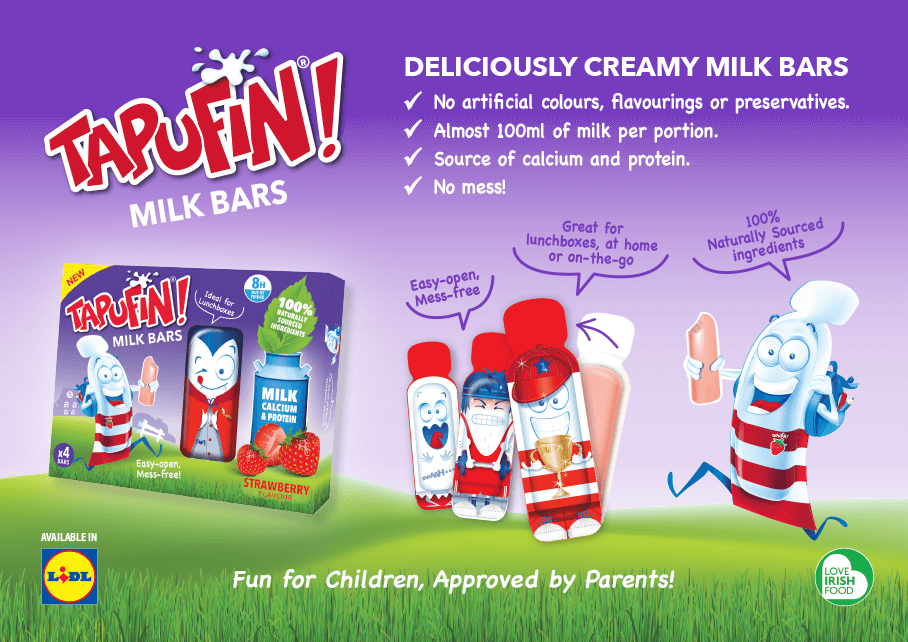 Tapufin Milk Bars are refrigerated, handheld dairy snacks that provide great taste, great convenience and a very strong nutritional profile. Each bar contains nearly 3g of Protein and only 2.3g of sugar whilst also being made with 100% naturally-sourced ingredients. It’s the lunchbox snack that kids think is a treat but parents know is good for them.